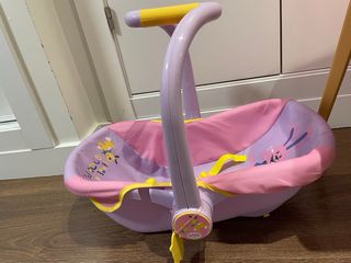 Este es un conjunto de juguete para bebé que incluye una silla de coche y un cambiador. Ideal para juegos de imitación. - Silla de coche de color lila y rosa con detalles de conejitos. - Incluye cinturones de seguridad amarillos. - Cambiador a juego con estampado de conejitos y texto. - Asa superior amarilla para transportar.