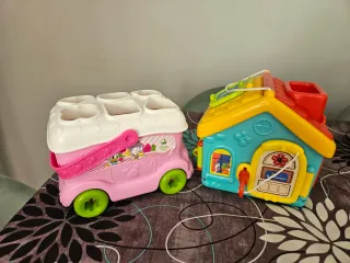 Lote de dos juguetes para bebé, una casa y un coche. - Autobus rosa con figuras de Disney. - Casa de colores con formas para encajar marca clementoni Se venden tambien por separado