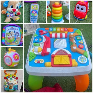 Lote de 8 piezas de juguetes Fisher-Price para bebés, musicales y educativos. - Peluche interactivo. - Mando a distancia. - Aro apilable. - Coche. - Libro musical. - Pelota. - Mesa de actividades. - Andador.