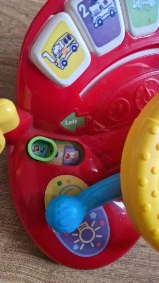 ¡Volante para vivir un montón de aventuras! - Se sujeta fácilmente a la silla de paseo o a la del coche, gracias a las tiras de sujeción, que permiten colocarlo cómodamente. - Cuando el bebé gira el volante, se activan frases divertidas y sonidos de motor. - Diferentes elementos para manipular: una llave para girar, un espejo, un retrovisor, una palanca de cambios. - Enseña palabras nuevas y los opuestos a través de canciones y raíces imaginativa, - 4 canciones y 20 melodías. - 2 modos de juego: sentado y de paseo. - Control de volumen.
