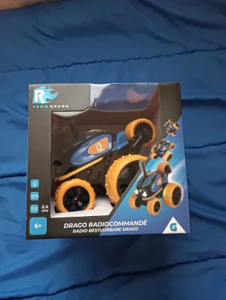 Vehículo de radiocontrol con capacidad para realizar volteretas y giros de 360 grados sobre si mismo. Nunca se ha sacado de su caja porque tenemos otro exactamente igual. Caja intacta. - Diseño en color verde y naranja. - Tracción 4x4. - Un color por cada lado. - Neumáticos blandos. - Incluye mando a distancia. En juguettos vale 24.99€.