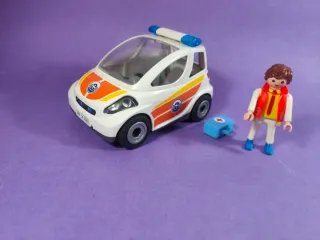 Set de Playmobil con un médico y su coche ambulancia. - Coche ambulancia blanco con detalles naranjas y azules. - Figura de médico con chaleco rojo. - Incluye un botiquín azul.