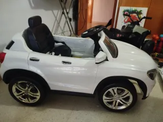 Coche eléctrico infantil de color blanco, perfecto para los más pequeños. - Diseño deportivo. - Asiento cómodo. - Volante. - Ruedas con llantas plateadas. -cargador -Mando para controlar también. ( También puede ir solo y no controlar con el mando) -solo le falta un retrovisor mini.