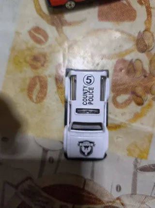 Coche de juguete Hot Wheels de policía. - Diseño de coche patrulla blanco. - Detalles de COUNTY POLICE y número 5 en la parte superior. - Insignia de policía en la parte trasera.