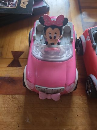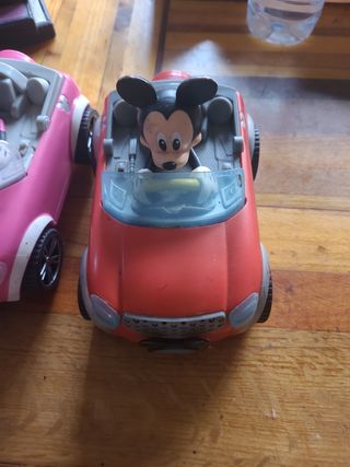 Coches de juguete de Mickey Mouse, ideales para niños. Son dos coches, uno rosa y otro rojo. El coche rojo incluye una figura de Mickey Mouse al volante. Los coches están en buen estado, aunque presentan algunas señales de uso. - Incluye dos coches de juguete. - Uno rosa y otro rojo. - El coche rojo tiene una figura de Mickey Mouse. - Perfectos para jugar. No tienen mandos