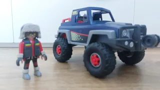Coche todoterreno de Playmobil en color azul. Ideal para aventuras. - Ruedas grandes con llantas rojas. - Parachoques delantero con luces. - Figura de Playmobil incluida con vestimenta de invierno. - Dinosaurio