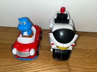Set de dos vehículos de juguete para bebés. - Coche rojo con figura de hipopótamo azul, le aprietas la cabeza y corre solo. - Moto de policía blanca y negra, con iluminacion y sonidos