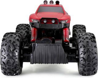 Coche teledirigido Rock Crawler de color rojo con mando a distancia. - Diseño deportivo y robusto. - Ruedas todoterreno de gran tamaño. - Suspensión independiente en las ruedas. Con regalo del coche naranja más pequeño , hay que hincharle las ruedas