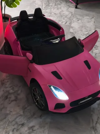 Coche montable infantil de color rosa con opción teledirigido - Diseño deportivo. - Asientos negros. - Puertas abatibles.