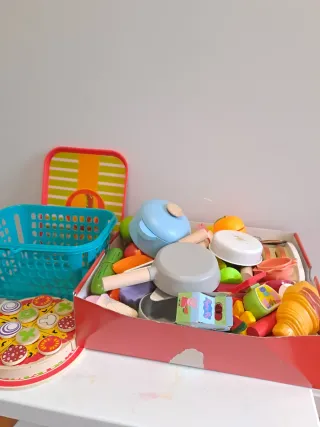 Set de juego de comida y vajilla para cocinita. Todo por 10€. - Incluye cesta de la compra azul con asas amarillas. - variedad de frutas y verduras de plástico. (caja no incluida) - Bandeja verde con tazas azules y platos de colores (rojo, azul, verde, amarillo). - Utensilios de cocina rojos, incluyendo espátula y brocha.