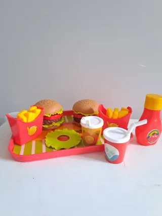 Conjunto de juguetes para una cocinita. - Incluye cesta azul, bandeja roja - set de comida rápida hamburguesa - set de pizza - set de desayuno - sets de fruta con velcro para separar, cortar con cuchillo - Utensilios de cocina y alimentos de juguete. MADRID. A recoger en calle Valderrodrigo