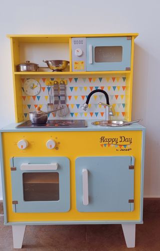Cocina de juguete en madera con 2 módulos, medidas 59,7x29,5x94,6 cm, altura encimera 60 cm. Esta nueva sin abrir. Precio original 139€