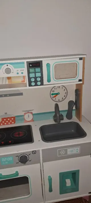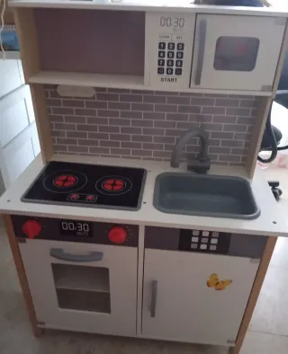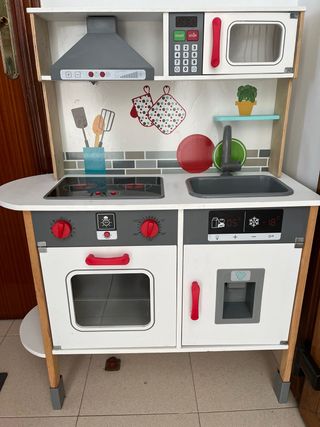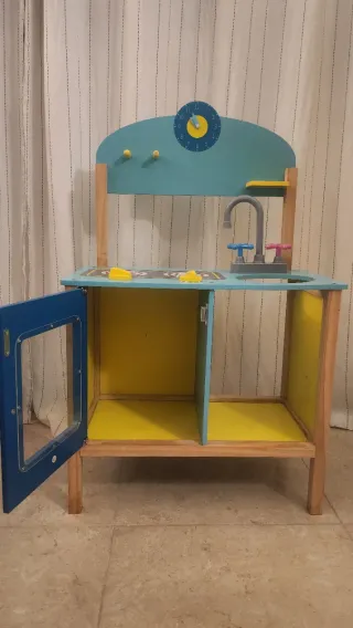 Divertida cocinita de madera para los más pequeños. Ideal para fomentar la imaginación y el juego. - Incluye horno, microondas y fregadero. - Encimera con fogones. - Accesorios de cocina como utensilios y platos. - la cocina esta en buen estado ,funcional ,pero en 2 partes esta pintado ,se puede borrar