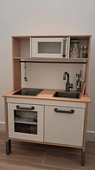 Cocinita de juguete de madera de Ikea, ideal para los más pequeños. Cuenta con un diseño moderno y funcional. Para recoger en el centro de Castellon - Encimera con fogones. - Fregadero con grifo. - Horno/armario inferior. - Microondas superior. - Barra para colgar accesorios.