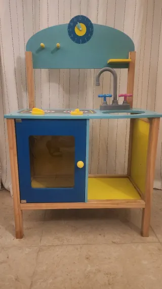 Divertida cocinita de juguete de madera, perfecta para horas de juego. - Incluye microondas, horno y fregadero. - Encimera con fogones. - Reloj decorativo. - Compartimentos para guardar. - Diseño colorido y atractivo. En condiciones aceptables.