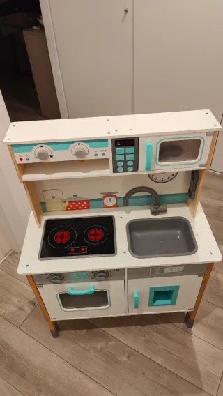 Divertida cocinita de juguete de madera, ideal para que los más pequeños desarrollen su imaginación. - Diseño de cocina completa con horno con pilas, microondas con sonido y fregadero. - Incluye accesorios como sartenes, ollas y utensilios.