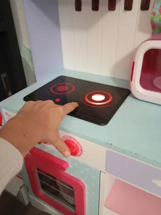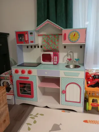 Divertida cocinita de juguete de la marca Imaginarium, ideal para los más pequeños. - Diseño colorido con detalles de lunares. - Incluye horno, microondas y fregadero. - Estanterías para almacenar. - Pomo de puerta con forma de flor. Solo un pequeño desperfecto que se puede tapar con un poco de vinilo adhesivo ( foto). Necesita una limpieza sencilla.