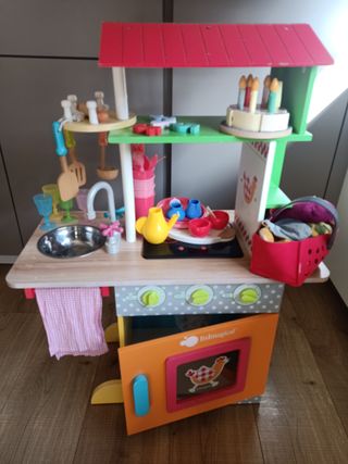 Divertida cocinita de madera de la marca Imaginarium. - Madera de calidad. - Incluye accesorios como espátulas y cazo. - Cuenta con vitrocerámica y horno. - Dispone de mandos giratorios y estantes. Se vende con accesorios adicionales como lavaplatos, maquina de café, batidora, tostadora y tetera. Buen estado general, aunque no está como nuevo. Falta el fregadero de plástico. Entrega en persona. No se hacen envíos para este artículo.