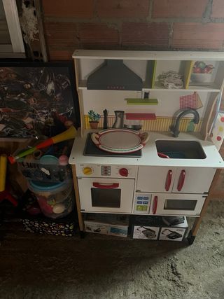 NO HAGO ENVÍOS, EN MANO. COMPLEMENTOS NO INCLUIDOS Cocina de juguete infantil de madera, en muy buen estado. Es una estupenda cocinita para que los más pequeños jueguen a cocinar. Tenemos dos en casa y esta segunda la verdad es que la ha usado muy muy poco. Es estupenda para formentar la creatividad y la imaginación así como el juego simbólico de tu peque. Los accesorios y juguetes no los incluyo, sólo sería lo que es el armazón de madera y lo que va incrustado en el propio armazón, pero las frutas y verduras, los trapitos etc... eso no.