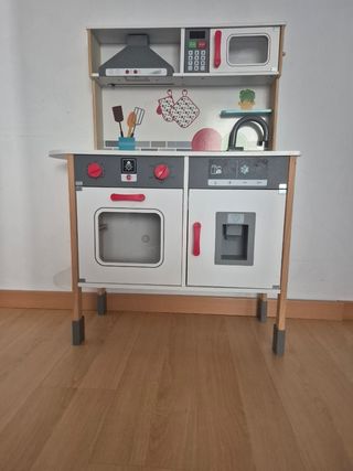 Cocina de juguete de madera, con algunos desperfectos del uso como se puede ver . Ideal para niños y niñas que quieran jugar a cocinar. - Incluye horno, microondas, fregadero , lavavajillas. lavadora y frigorifico con sonidos y luces. - Diseño moderno y elegante en color blanco y gris. - Medidas aproximadas: 120cm de alto x 110cm de ancho x 40cm de profundidad. - Perfecta para fomentar la creatividad e imaginación.