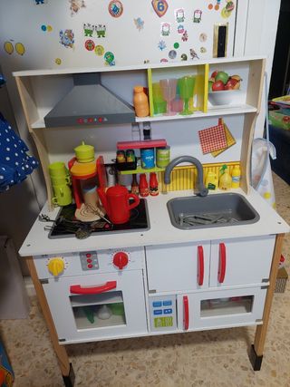 Cocina de juguete de madera de la marca Lidl. Está en muy buen estado y es perfecta para que los más pequeños se diviertan. - Incluye numerosos accesorios. - Diseño moderno en blanco y rojo. - Gran tamaño para jugar con comodidad.