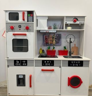 Cocinita de madera de Lidl, ideal para los más pequeños. Cuenta con varios compartimentos y accesorios. - Diseño blanco y rojo. - Incluye horno, microondas y lavadora. - Pila y grifo. - Encimera con fogones. El grifo no se sujeta bien y la puerta de abajo de enmedio se sale ...regalo todos los cacharritos que tengo, platos, cubiertos y vasos