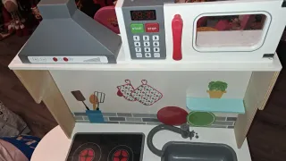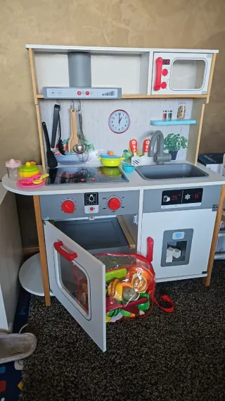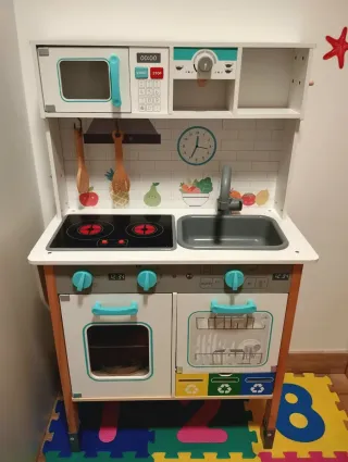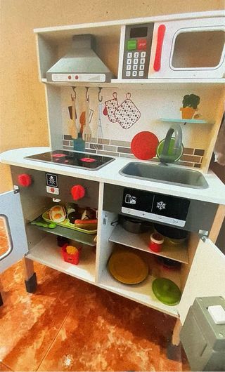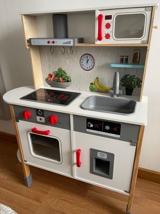 Cocinita de juguete de madera en buen estado. La placa de cocina lo tengo protegido con su plastico. Es súper estable y rígida. Ni se tambalea. Diria que una de las mejores cocinas del mercado. Medidas ancho 68.5 cm, alto 100 cm y fondo 30 cm. Incluye accesorios como horno, fogones y fregadero con sonidos y luces.. Regalo cacerolas, utensilios etc y varias comidas que tengo. Estructura de madera resistente y segura.