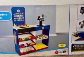 Nueva a estrenar. Se entrega desmontada en su caja. Tienda Lidl de madera con escáner de efectos luminosos y sonoros y cinta transportadora con manivela manual. Estructura estable de madera con estantes por ambos lados para guardar y exponer artículos. Caja registradora con función de calculadora y campo para firmar. Lector de tarjetas con tarjeta bancaria de juguete incluida. Cajón de dinero con dinero de juguete. Con todos los accesorios: Mostrador, cinta transportadora, separador de productos, expositor de folletos.... Hago envíos. tag: cocinita, cocina, pokemon, manualidades, garaje