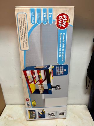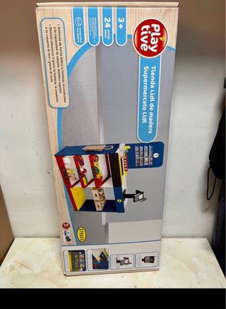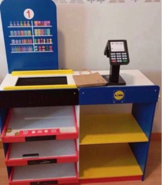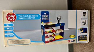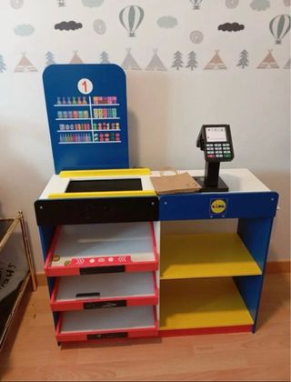 Nueva a estrenar. Se entrega desmontada en su caja. Tienda Lidl de madera con escáner de efectos luminosos y sonoros y cinta transportadora con manivela manual. Estructura estable de madera con estantes por ambos lados para guardar y exponer artículos. Caja registradora con función de calculadora y campo para firmar. Lector de tarjetas con tarjeta bancaria de juguete incluida. Cajón de dinero con dinero de juguete. Con todos los accesorios: Mostrador, cinta transportadora, separador de productos, expositor de folletos.... Hago envíos. tag: cocinita, cocina, pokemon, manualidades, garaje.