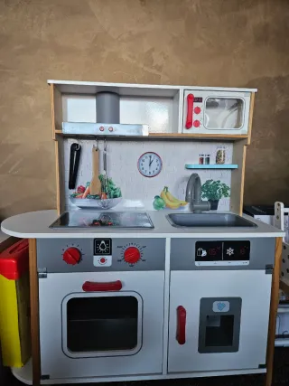 Divertida cocinita de juguete del Lidl, ideal para los más pequeños. Incluye varios accesorios para horas de juego. - Incluye utensilios de cocina, recipientes y alimentos. - Puertas y compartimentos para guardar. Tiene un pequeño daño en la puerta del horno pero funciona perfectamente.