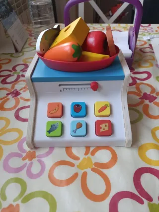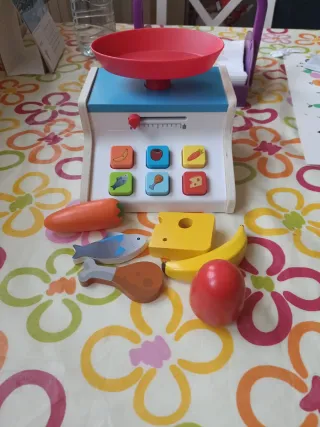 Báscula de juguete de madera con accesorios de comida, ideal para cocinitas. - Incluye varios alimentos de madera. - Diseño colorido y atractivo. - Marca Lidl. - Está completa, falta la caja