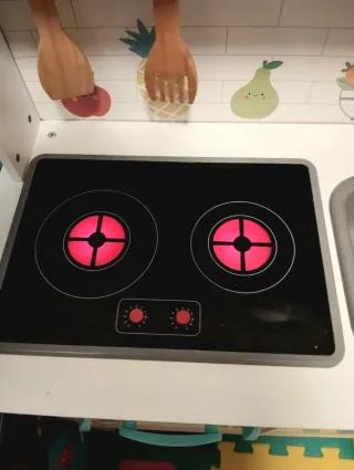 Cocinita de juguete de la marca Lidl, muy poco uso, funciona todo, los fuegos, el microondas el horno la campana... muy cuidada. - Diseño moderno y completo. - Montada y limpia - Ideal para horas de diversión.