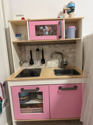 Cocinita de juguete de la marca Ikea, en color rosa. está tuneada y habría que quitar peganitas y va sin accesorios - Incluye microondas con puerta. - Fregadero y grifo. - Encimera con fuegos. - Armario inferior con puerta y estante.