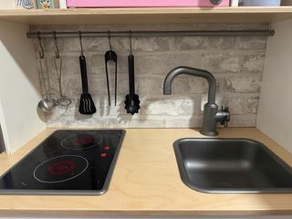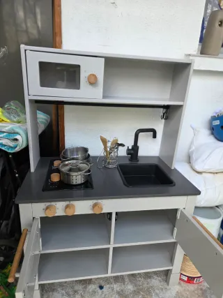 Cocinita de madera, modelo de IKEA. Consta de: - Encimera con fogones. - Fregadero. - Horno. - Armarios de almacenamiento. Cuenta, además, con elementos complementarios como batidora que suena, tostadora, máquina registradora, menaje y juguetes variados en forma de alimentos. Es muy completa.