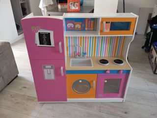 Preciosa cocinita de juguete infantil, en muy buen estado. Ideal para que los más pequeños se diviertan jugando a cocinar. - Incluye fogones, horno, fregadero y nevera. - Diseño colorido y atractivo. - Fabricada en madera. Se entrega con algunos accesorios.