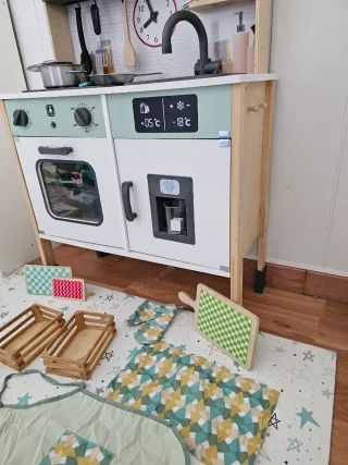 ¡El regalo estrella para estos Reyes! 🎁 Cocinita de madera IKEA. Haz realidad el sueño de los más pequeños con esta preciosa cocinita de madera clara. Es el juguete más buscado por su diseño nórdico que queda ideal en cualquier salón o habitación. Detalles realistas: Encimera con dos fuegos, fregadero con grifo y puertas abatibles para guardar todos sus "utensilios". Calidad IKEA: Robusta, duradera y segura. Ventaja Real: ¡Ya está montada! Ahórrate horas de tornillos y dásela lista para jugar el día 6. ¡Está impecable, corre que vuela! ✨