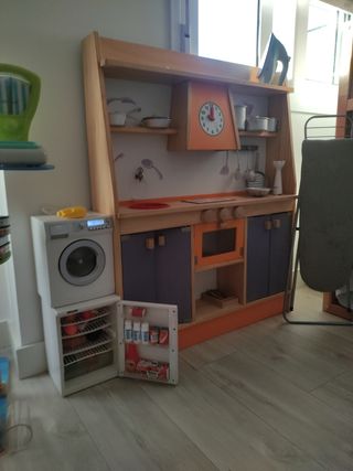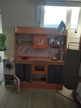 Divertida cocinita de madera para que los más pequeños jueguen a ser chefs. - Incluye varios accesorios dmicroondas q funciona lavadora tostadora y muchos mas y una bolsa llena de platos cubiertos ollas y comidita merece la pena por tantas cosas q lleba la cocinita la usado mui poco - Fabricada en madera resistente.