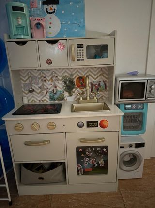 Cocinita infantil de madera – Grande, completa y enbuen estado Vendo esta preciosa cocinita de madera con múltiples funciones, ideal para que los peques desarrollen su imaginación y jueguen durante horas. Es de tamaño grande y muy estable. 📏 Dimensiones aproximadas: 101 cm (alto) x 105 cm (ancho) x 40 cm (fondo) Incluye: • Nevera y congelador independientes • Horno con mandos giratorios • 3 fogones • Microondas con panel decorativo • Fregadero con grifo • Lavadora (la tapa está sujeta, pero se mantiene en su sitio) • Estantes y zonas de almacenaje 🔧 Estado: Tiene algunas marcas de uso normales