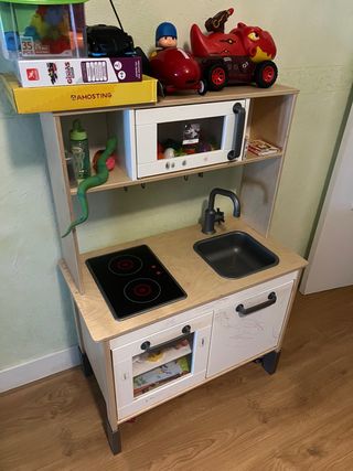 Cocinita de juguete de Ikea, ideal para los más pequeños. - Diseño de madera. - Incluye fregadero y vitrocerámica. - Puertas con tiradores. - Compartimento con ventana. Complemtos de cocinita incluidos