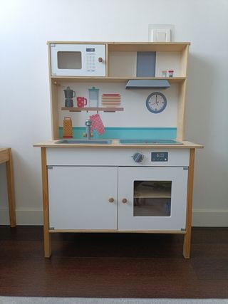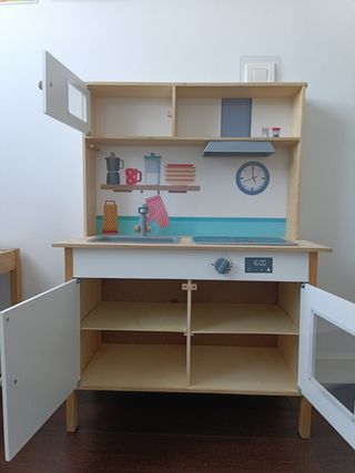 Cocina de juguete IKEA en perfecto estado. Ideal para que los más pequeños se diviertan. Los precios originales en IKEA son: Juego de utensilios 6 euros, juego de sartenes 12 euros, cocinita 100 euros. Se vende totalmente montada (lleva más de 1h hacerlo) - Incluye fogones que se iluminan, fregadero y horno de juguete. - Material de madera resistente y fácil de limpiar. - Diseño compacto y fácil de guardar. - Decenas de complementos de juguetes en forma de comida
