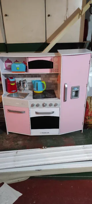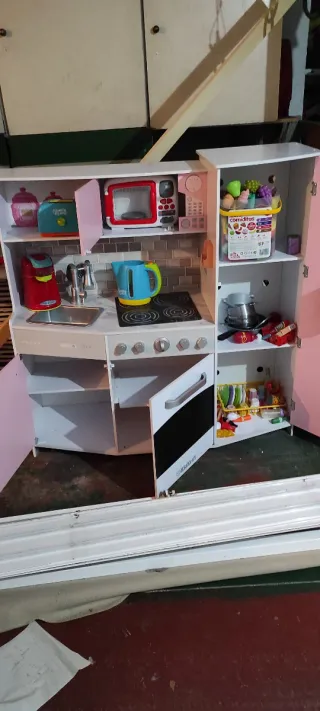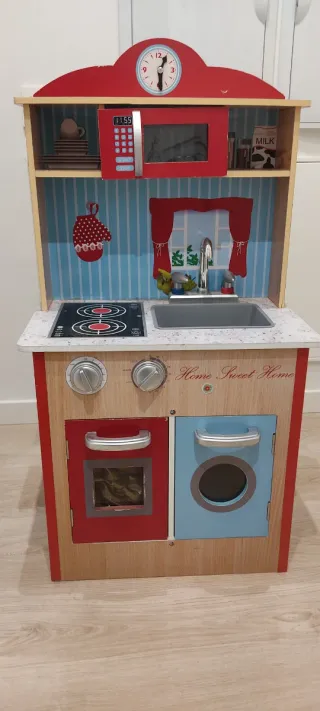 Divertida cocinita de madera que incluye todos los accesorios que se ven en las fotografías. Tiene luz y sonidos en los fogones. Está muy bien cuidada, solo tiene que no llego a entrar del todo el tornillo lateral que sale en la fotografía.