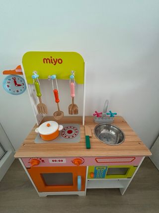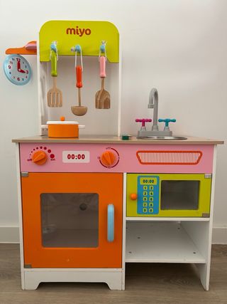 Cocinita de madera para niños, marca Miyo. - Incluye accesorios como ollas y utensilios. - con horno y microondas. - Pila con grifo. - Reloj decorativo medidas: 85x60x30