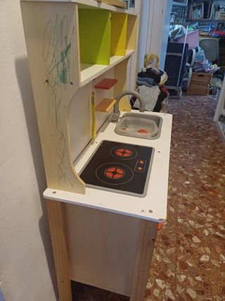 Divertida cocinita de juguete para horas de juego. - Incluye microondas, horno y fogones. - Dispone de fregadero y grifo. - Estantería superior con accesorios. - Compartimento inferior con puerta. Tiene algunas zonas con garabatos pero está en muy buen estado.