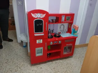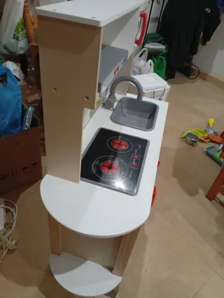 Cocinita de juguete de madera del Lidl como nueva. Muy poco uso. - Incluye todos los accesorios originales: vasos, tazas, paletas, cubitos de hielo, gorro y delantal de juguete. - Cuenta con horno, microondas y fogones que se encienden y emiten ruidos de cocción, también dispensador de cubitos de hielo. - Incluye muchos accesorios, sartenes, ollas, cubiertos, tarta de cumpleaños que se divide en porciones, alimentos de madera que se pueden dividir en dos y muchas cosas más. Por el tamaño del producto no lo enviamos.