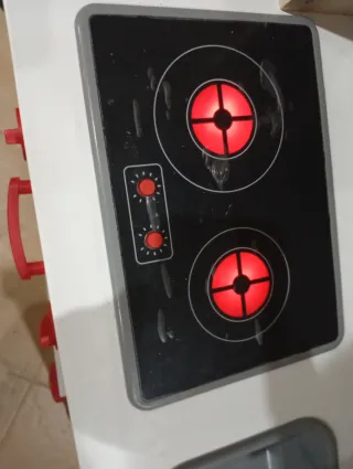 Está en muy buen estado, sólo hay que quitarle unas pegatinas del cristal de una puerta. Las puertas están perfectas y los fogones funcionan con pilas.