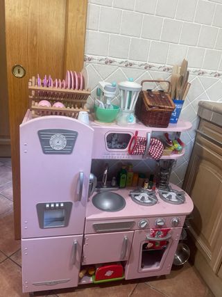 COCINA COMPLETA: fregadero con grifo, microondas, nevera, horno con puerta transparente, cortinas, etc. - CAPACIDAD DE ALMACENAJE: espacio para guardar platos, vasos, sartenes. - EDAD RECOMENDADA: para mayores de 3 años. Producto que ha estado expuesto en tienda para que los niños jueguen y demás por lo que tiene algunas picadas y rallones pero en general está en buen estado.