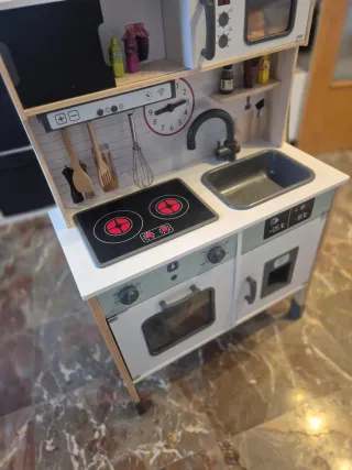 Esta cocinita de juguete es ideal para colocar en rincones, aprovechando al máximo el espacio disponible. Además, cuenta con efectos de luz y sonido en los fogones, lo que proporciona una experiencia de juego más envolvente y realista.Con máquina de hielo, microondas y horno y lavadora, además de un reloj de juguete que desarrolla las habilidades de los niños para gestionar el tiempo.Esta cocinita de madera infantil incluye un juego de cinco piezas con cacerola, cuchara y utensilios.Producto que ha estado expuesto en tienda para que los niños jueguen. Por lo que tiene algunos golpes y ralladas.