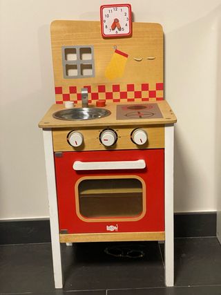 Divertida cocinita de juguete fabricada en madera, ideal para que los más pequeños desarrollen su imaginación. - Diseño colorido en rojo y madera natural. - Incluye horno, fogones, microondas y fregadero. - Colgadores para utensilios. - Medidas 91 x 60 x 33 cm (altura a los fogones 47 cm) - De regalo utensilios, cafetera, cacerolas, tazas y ser de comiditas de juguete - Tiene roces y pequeños desperfectos del uso (los q se ven en las fotos últimas)