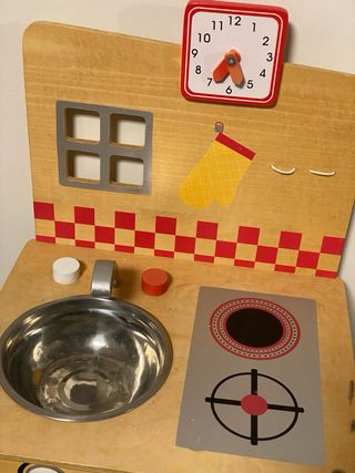 Divertida cocinita de juguete de madera, ideal para los más pequeños. - Diseño de cocina con horno y fogones. - Incluye fregadero y reloj decorativo. - Acabado en madera con detalles en rojo y blanco.