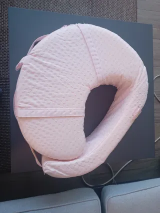 Cojín de lactancia de la marca Cucut en color rosa, ideal para primeras semanas, mejora la implantación de lactancia, recomendado por Matrona. Se rompió el cierre de la correa, como se ve en la foto, aunque tampoco es necesario para su uso.